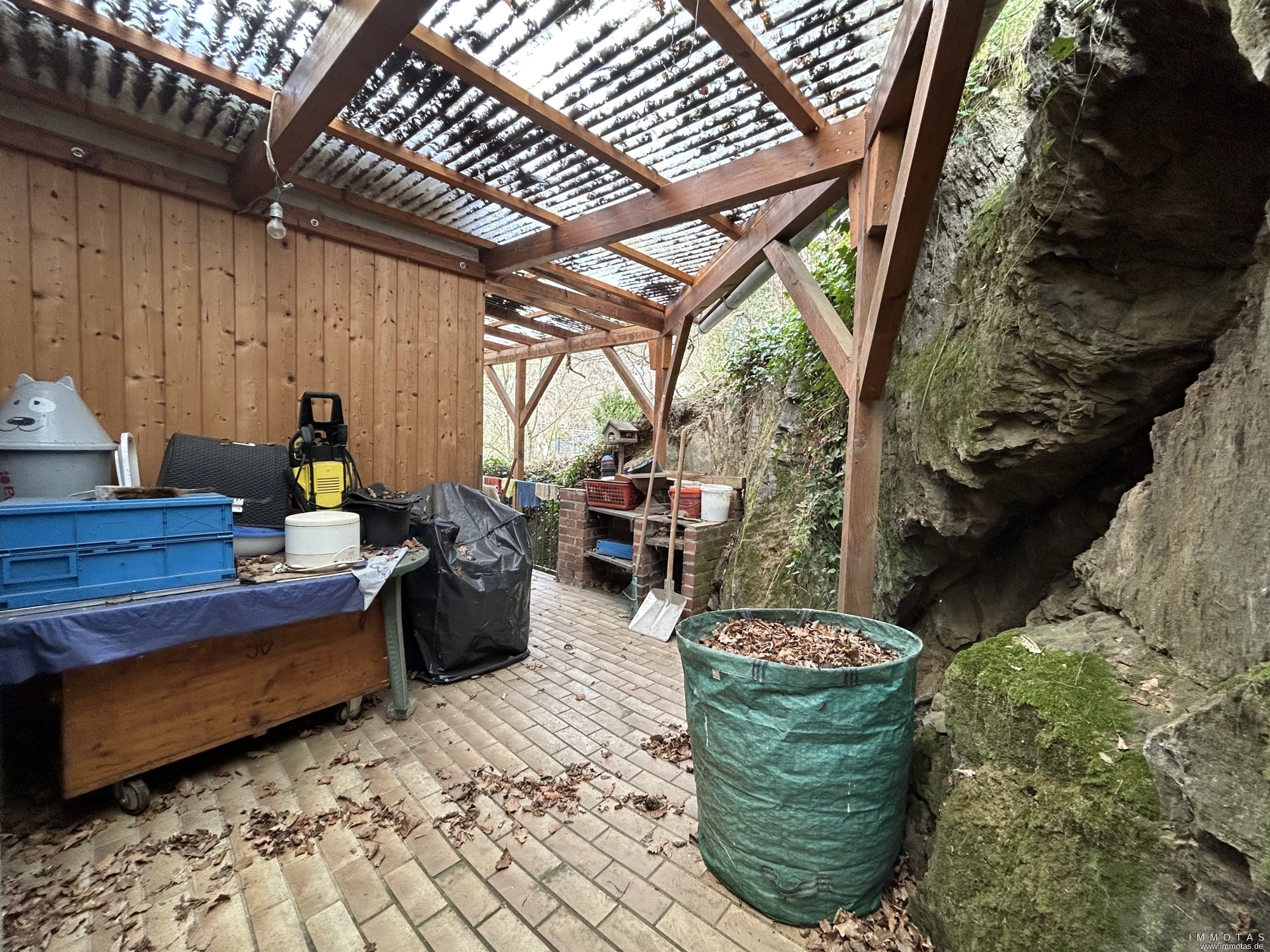 Die Wohnung verfügt über mehrere attraktive Außenbereiche: einen Balkon am Bestandsgebäude, eine Dachterrasse am Bestandsgebäude sowie einen schmalen Balkon am Anbau. Das dazugehörige weitläufige Hanggrundstück unterstreicht den besonderen Charakter der Immobilie. Stellplatzmöglichkeiten bestehen im öffentlichen Straßenraum.
