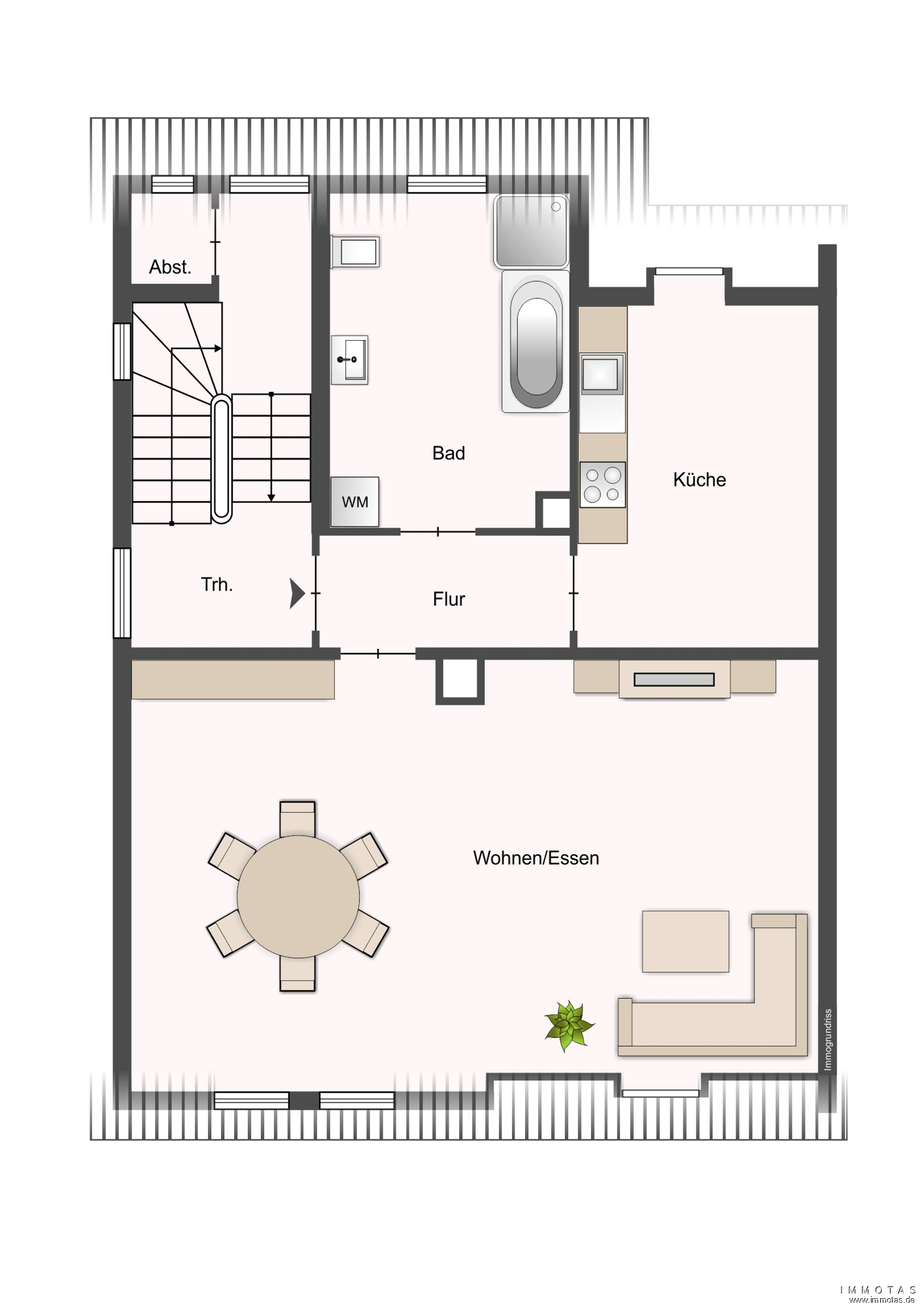Im Erd- und Obergeschoss befinden sich jeweils ein Badezimmer mit Wanne, Dusche und Waschmaschinenanschluss, die über die vorhandene Gasinstallation beheizt und mit Warmwasser versorgt werden. Zusätzlich gibt es praktische Abstellräume im Hausgang beider Etagen.