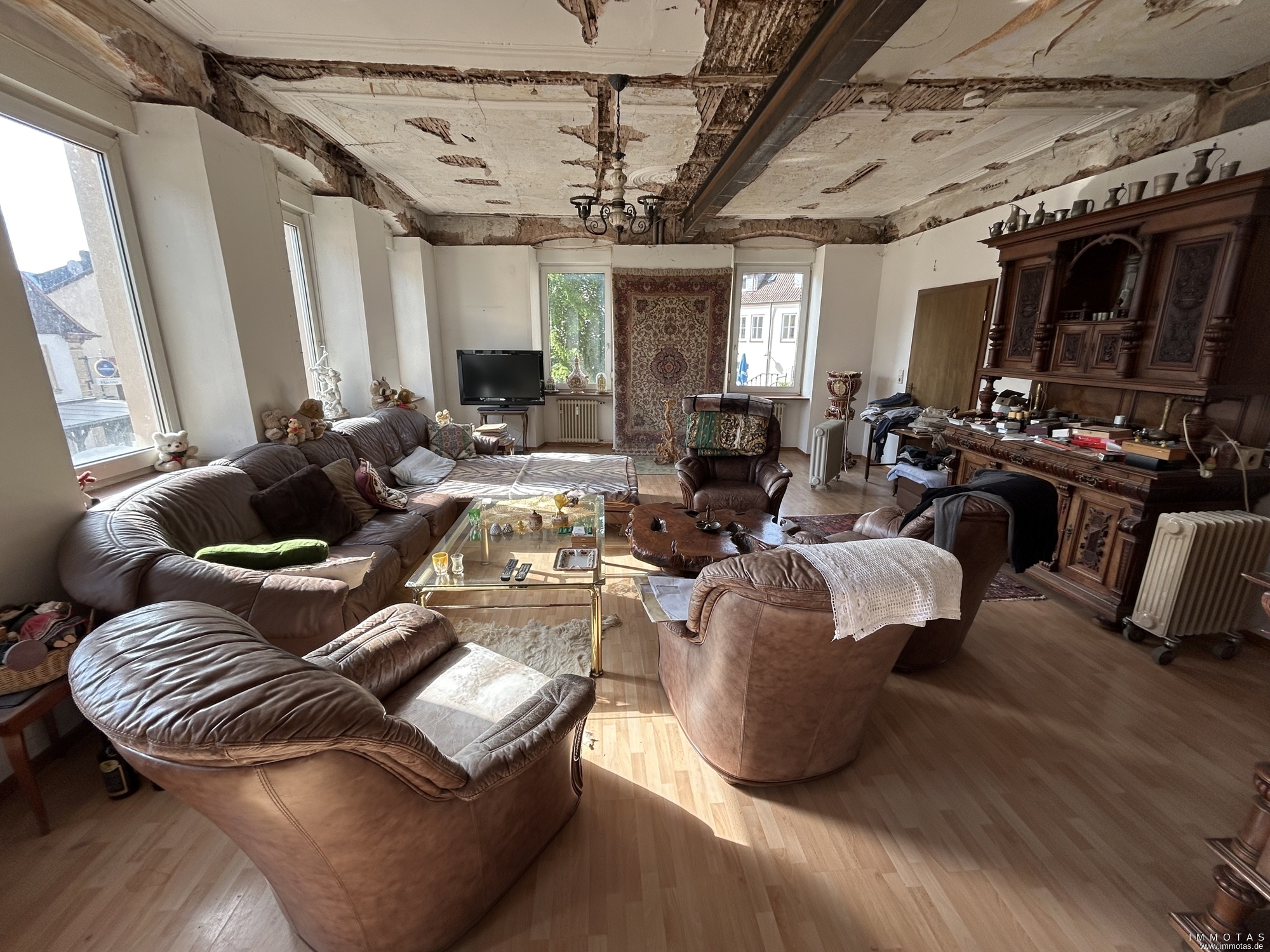 Die Immobilie befindet sich insgesamt in einem sanierungs- und modernisierungsbedürftigen Zustand. In Teilen der Hauptwohnung, insbesondere im Wohnbereich, wurde die Decke bereits entfernt, sodass sich dieser Bereich derzeit im Rohbauzustand befindet und entsprechende Ausbauarbeiten erforderlich sind. Insgesamt besteht daher ein deutlicher Renovierungs- und Sanierungsbedarf, wodurch sich für Käufer jedoch gleichzeitig die Möglichkeit ergibt, die vorhandene Bausubstanz individuell zu modernisieren und neu zu gestalten.