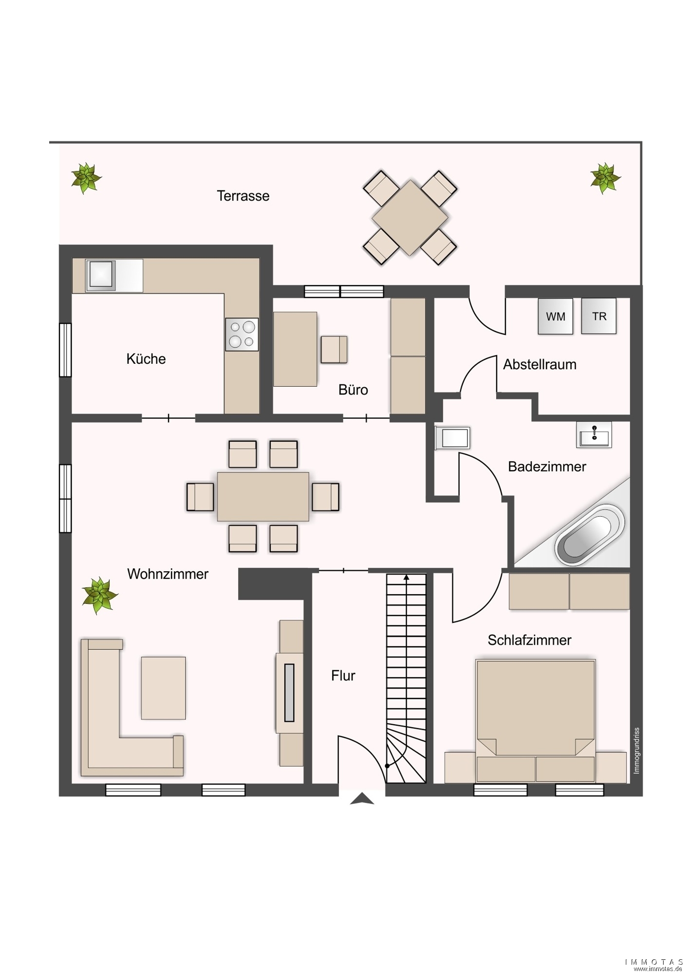 Im Erdgeschoss bildet der großzügige Wohn- und Essbereich den zentralen Lebensmittelpunkt des Hauses. Von hier aus erschließen sich die angrenzende Küche sowie zwei weitere Zimmer, welche sich ideal als Büro oder Gästezimmer eignen. Außerdem befindet sich auf dieser Ebene ein Badezimmer mit Badewanne. Ergänzt wird das Raumangebot durch einen praktischen Abstellraum, der direkten Zugang zur Terrasse bietet. Die Möglichkeit, den Außenbereich bequem zu nutzen, lädt zu entspannten Stunden im Freien ein.