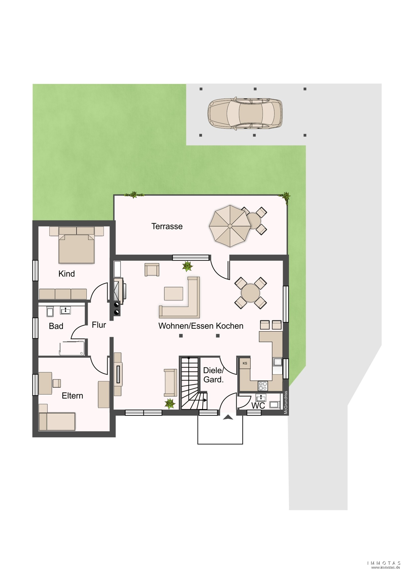 Im Erdgeschoss erwartet Sie ein offener und harmonischer Grundriss. Über einen separaten Eingangsbereich gelangt man zunächst zum Gäste-WC sowie zum Treppenaufgang in das Dachgeschoss. Der lichtdurchflutete Wohn- und Essbereich mit Kaminofen lädt zum gemütlichen Verweilen ein und bietet direkten Zugang zur Terrasse sowie zur angrenzenden Einbauküche. Ein Flur führt zu den privaten Räumen des Erdgeschosses: einem Kinderzimmer, dem Elternschlafzimmer und einem modernen Tageslichtbad mit ebenerdiger Dusche.