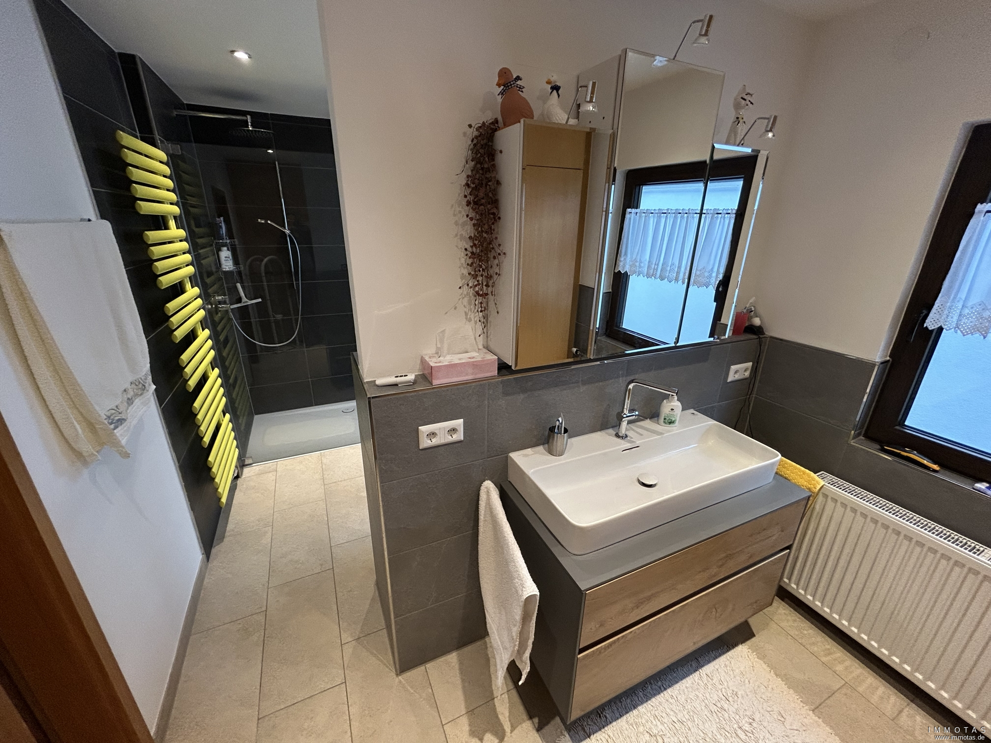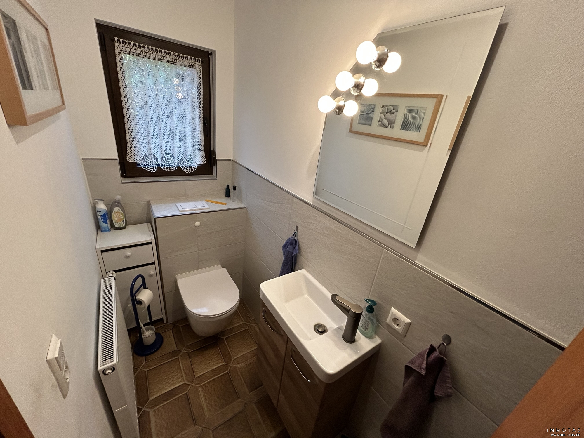 Im Inneren präsentiert sich das Haus gepflegt und einladend. Parkett- und Fliesenböden schaffen eine angenehme Wohnatmosphäre, während Spanndecken im Wohn- und Schlafzimmer eine moderne und ruhige Raumwirkung unterstützen. Der zentrale Wohnbereich wird durch ein gemütliches Kaminzimmer mit Kaminofen ergänzt, das insbesondere an kühleren Tagen für eine behagliche Stimmung sorgt. Das Tageslicht-Badezimmer wurde im Jahr 2024 vollständig erneuert und verfügt über eine ebenerdige, begehbare Dusche, moderne Sanitärausstattung und hochwertige Oberflächen. Ein separates Gäste-WC mit Fenster im Erdgeschoss rundet den Komfort ab. Ebenfalls im Jahr 2024 wurde eine neue Einbauküche eingebaut, die auf Verhandlungsbasis übernommen werden kann.