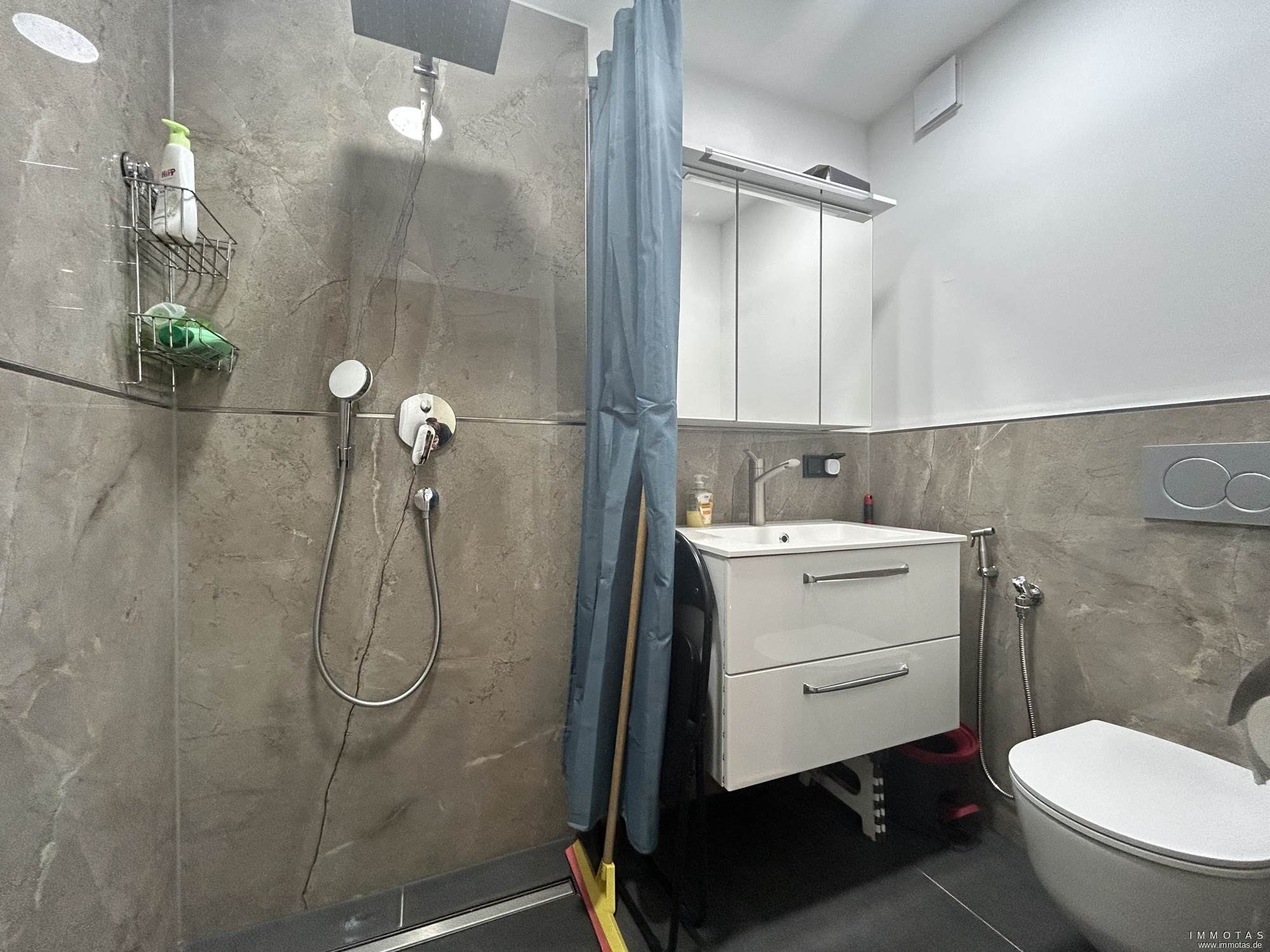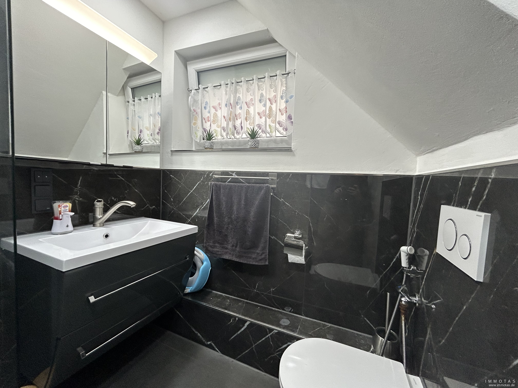 Das Haus verfügt über zwei modernisierte Duschbäder – sowohl im Erdgeschoss als auch im Obergeschoss – jeweils mit Feinsteinzeug an Boden und Wänden. Das Obergeschoss bietet darüber hinaus Zugang zu einem Balkon, während im Außenbereich eine großzügige Terrasse, ein gepflegter Garten sowie ein Innenhof mit elektrischem Hoftor zum Verweilen einladen. Ein Stellplatz im Freien ist ebenfalls vorhanden.