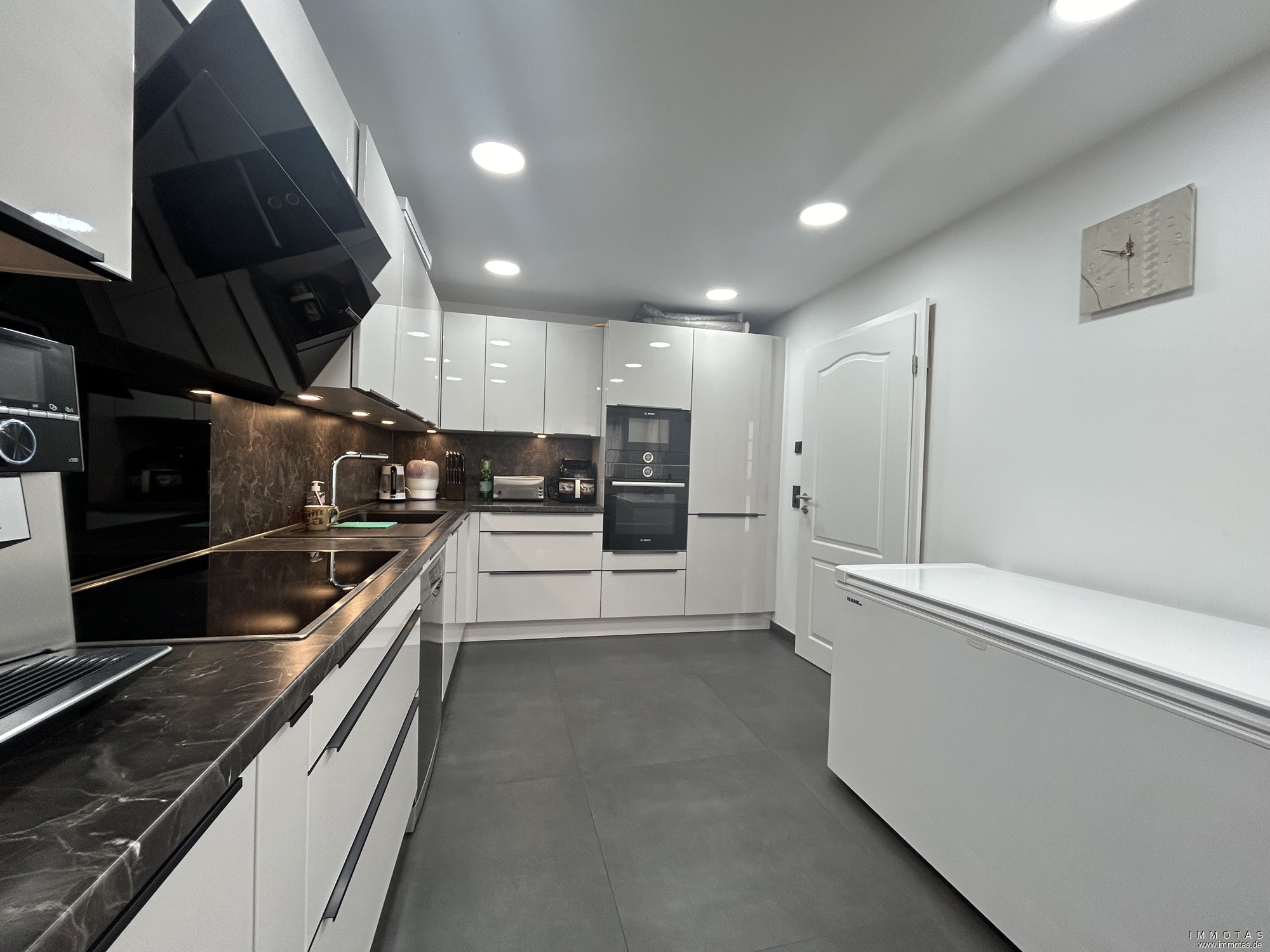 Im Innenbereich wurde großer Wert auf eine hochwertige Ausstattung gelegt: Die Böden sind mit Fliesen und Vinylbelägen versehen, moderne Einbaustrahler sorgen für eine stilvolle Beleuchtung. Die Einbauküche ist hochwertig ausgestattet und fügt sich harmonisch in das offene Wohnkonzept ein.