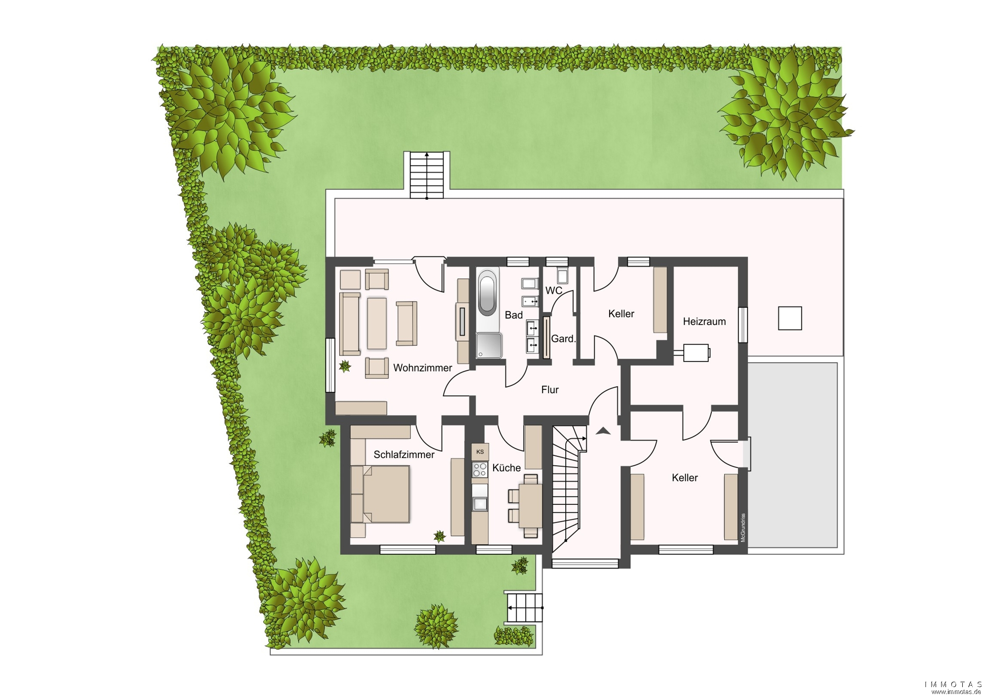 Als Bodenbeläge kommen Fliesen, Laminat, Echtholzdielen, Vinyl sowie Naturstein im Treppenhaus zum Einsatz. Abgerundet wird das Angebot durch zwei Einzelgaragen sowie zwei Außenstellplätze.