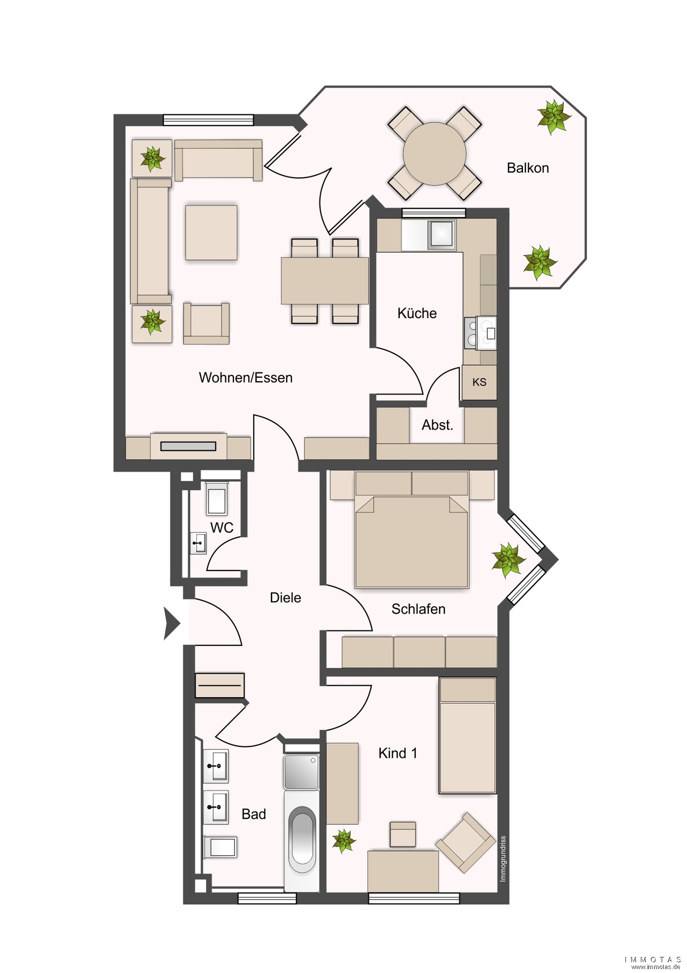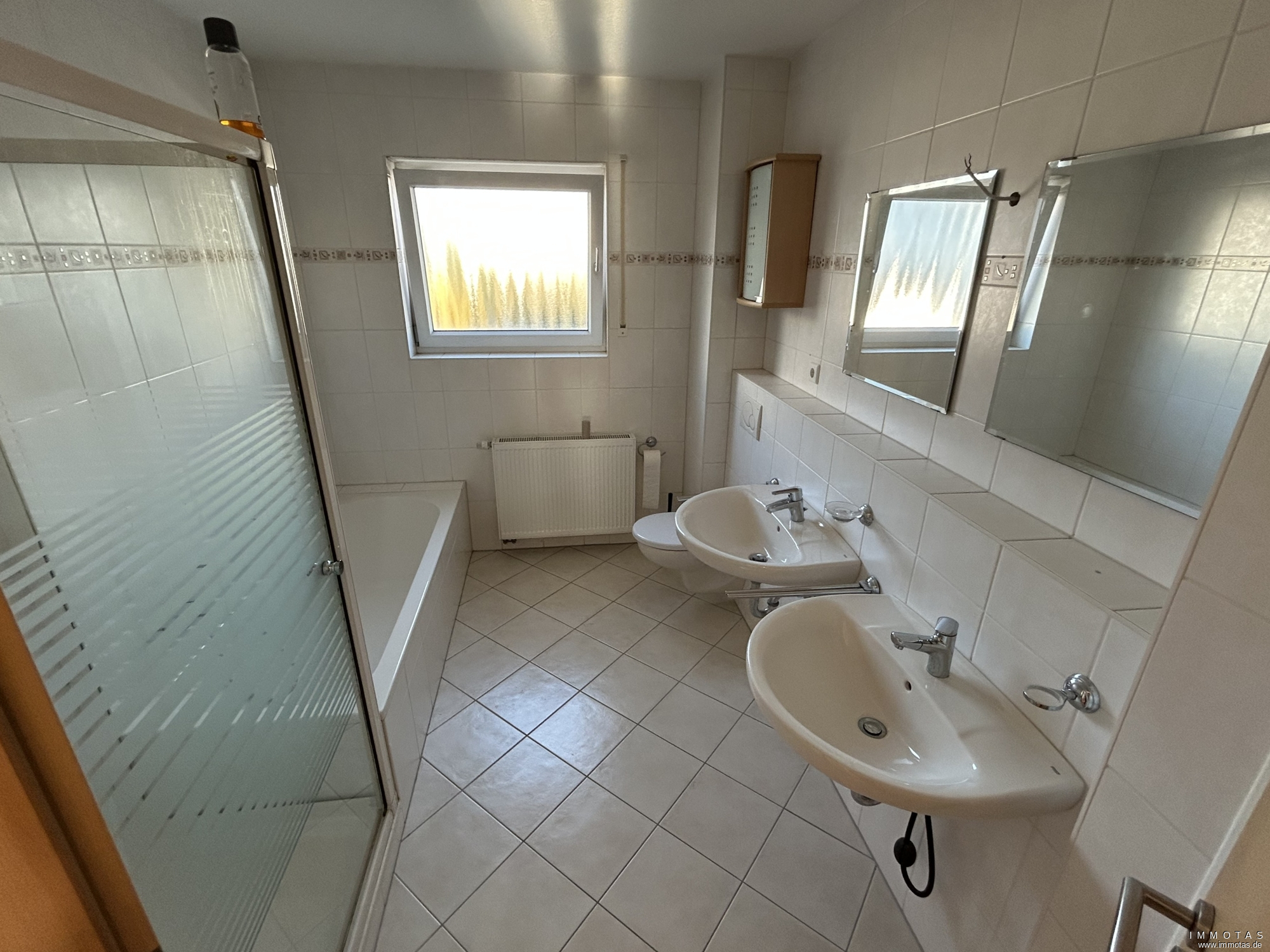 Die Wohnung im 1. Obergeschoss bietet eine Wohnfläche von 89 m² sowie zusätzliche 10 m² Nutzfläche (Kellerraum) und überzeugt durch einen durchdachten Grundriss mit insgesamt drei Zimmern, darunter zwei Schlafzimmer, ein geräumiges Wohn- und Esszimmer sowie eine separate Küche. Ein Abstellraum bzw. eine Speisekammer sorgt für zusätzlichen Stauraum. Das Tageslichtbad ist komfortabel mit Doppelwaschbecken, Badewanne und Dusche ausgestattet; ergänzend steht ein innenliegendes Gäste-WC zur Verfügung. Die Ausstattung umfasst Parkett- und Fliesenböden, Kunststofffenster mit 2-fach-Verglasung aus dem Baujahr. Beheizt wird die Immobilie mit fossiler Fernwärme aus einem Heizwerk. Der Balkon mit einer attraktiven Größe bietet einen angenehmen Außenbereich zur Entspannung.