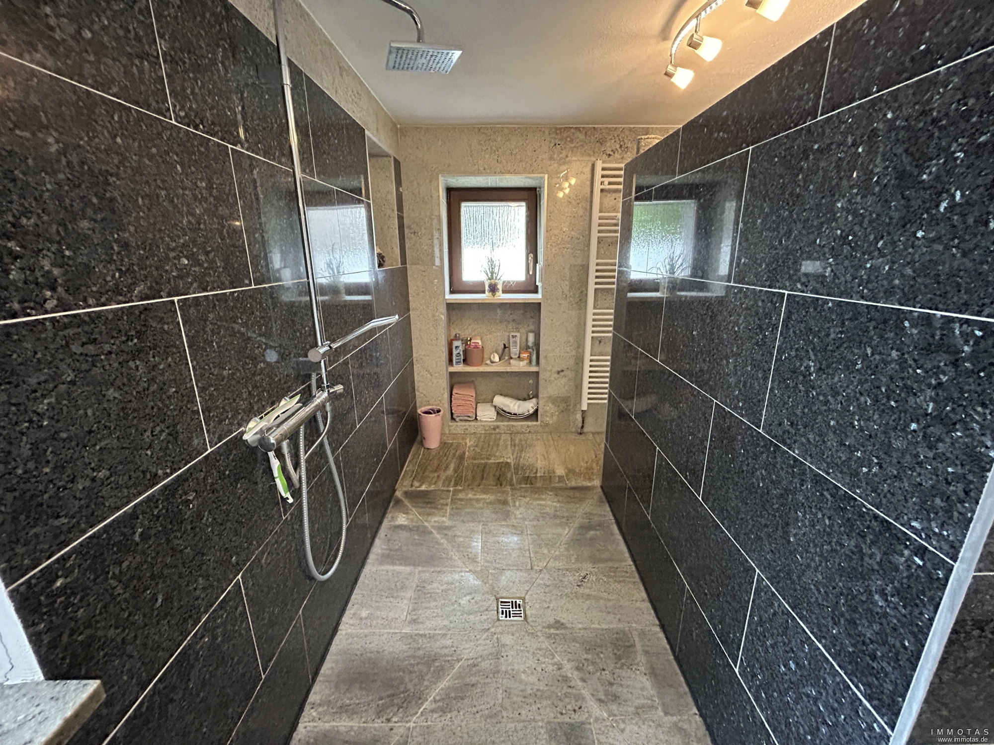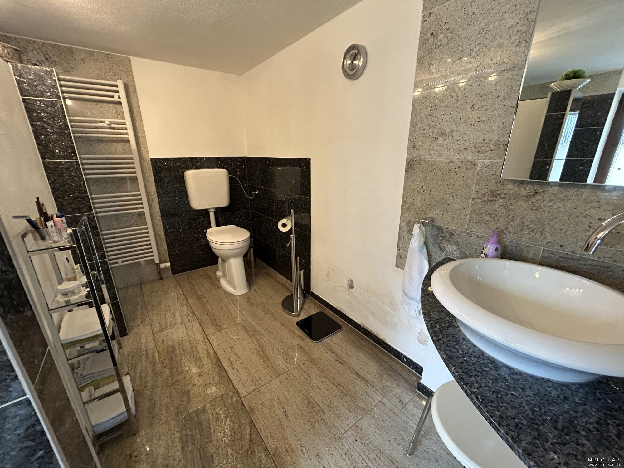 Das Erdgeschoss bildet mit einem großen Empfangsbereich den zentralen Mittelpunkt des Hauses. Von hier aus erschließen sich die einzelnen Bereiche der Immobilie. Im Erdgeschoss sind dies neben dem Schlafzimmer auch das Badezimmer mit begehbarer Dusche, das Gäste-WC sowie der Hauswirtschaftsraum. Außerdem besteht ein direkter Zugang zur Terrasse, sowie zu der angrenzenden Außenfläche.