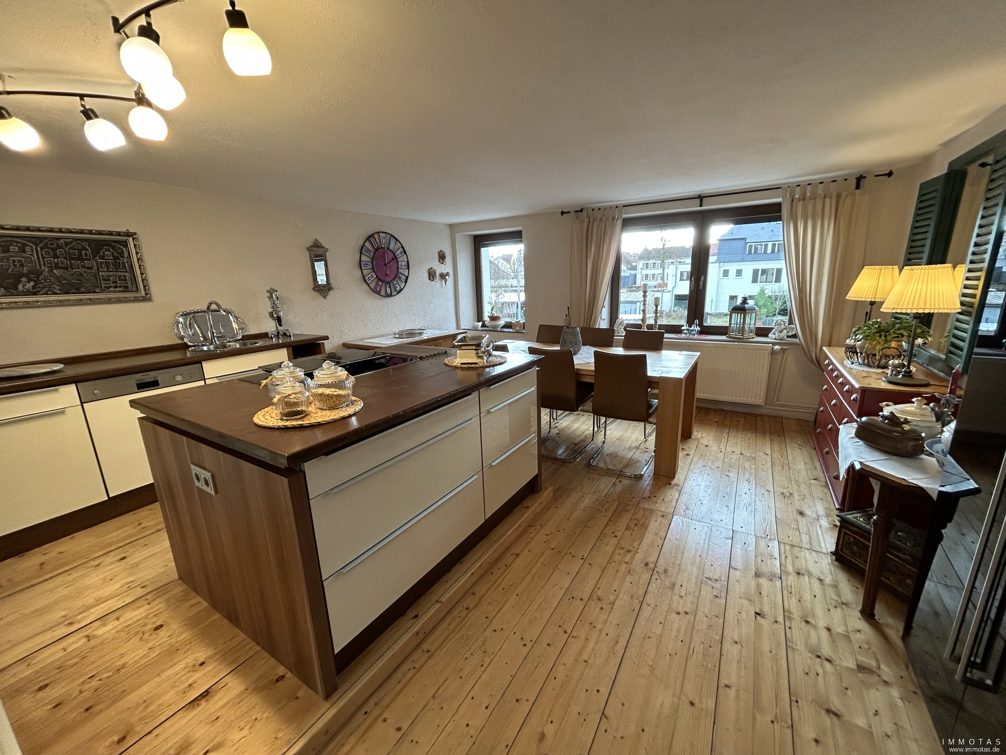 Im Obergeschoss befindet sich mit dem großzügige Wohn- und Essbereich das Herzstück des Hauses. Über den Wohnraum besteht eine direkte Anbindung an den Balkon welcher zusätzlichen Aufenthalts- und Freiraum bietet. Die offene Küche mit einer integrierten Kochinsel bietet ausreichend Platz für einen großen Esstisch und geht ohne Abschluss in den Wohnraum über.