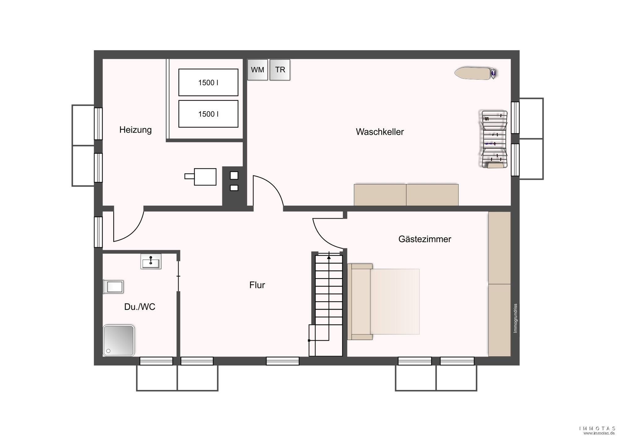 Die Wohnfläche beträgt ca. 99 m² und verteilt sich auf insgesamt 5 Zimmer, darunter 3 Schlafzimmer sowie 2 Badezimmer. Im Erdgeschoss befindet sich ein Tageslichtbad mit Badewanne, im Kellergeschoss ein weiteres Tageslichtbad mit Dusche. Ergänzend stehen ein Abstellraum sowie weitere Nutzflächen im Kellergeschoss zur Verfügung.